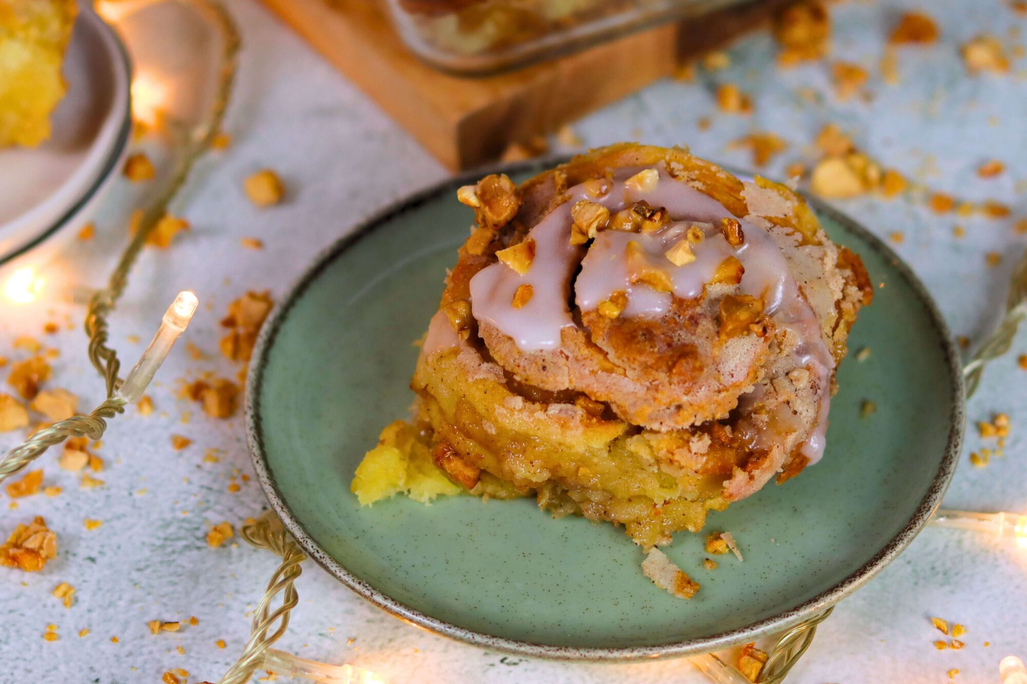 Ρολάρουμε σιγά σιγά σε σφιχτό ρολό. Κόβουμε σε 8 μεγάλα κομμάτια είτε με ένα κοφτερό μαχαίρι είτε με κλωστή.