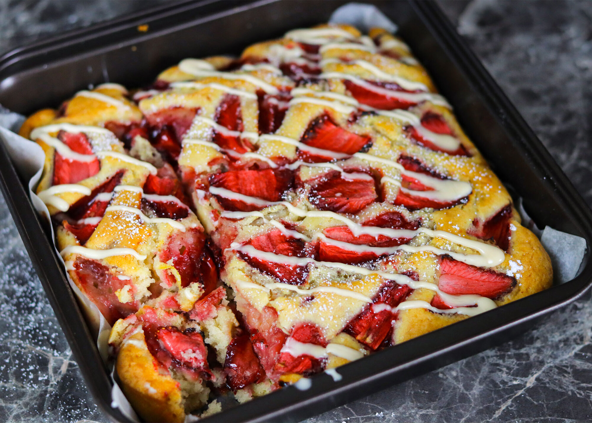 Τοποθετούμε σε όλη την επιφάνεια τις κομμένες φράουλες και ψήνουμε σε προθερμασμένο φούρνο στους 170 βαθμούς στον αέρα στην μεσαία σχάρα για 40-45' περίπου.