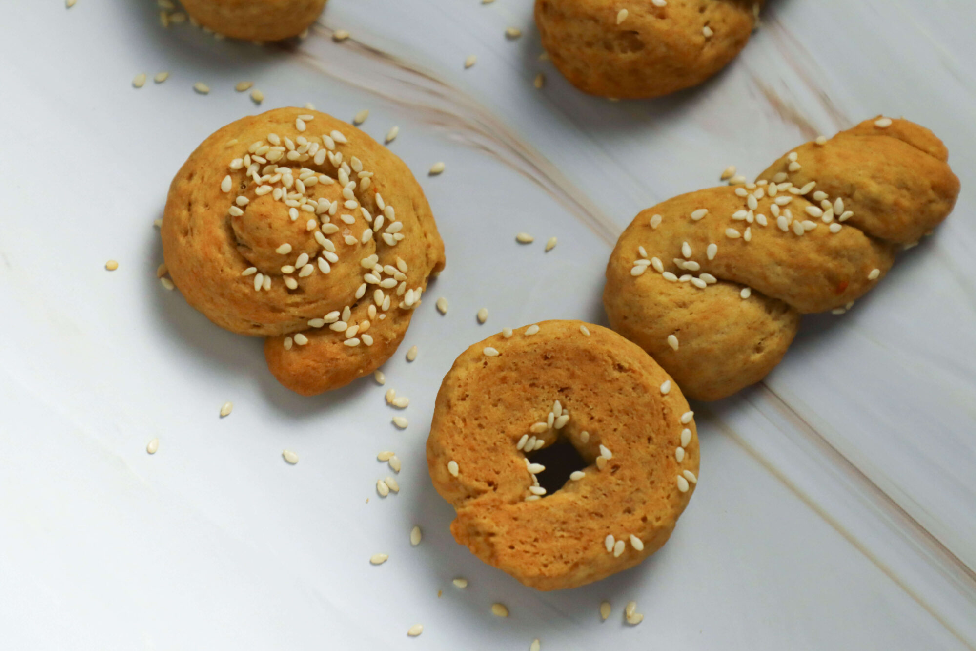 Βουτάμε στο σουσάμι τα κουλουράκια και τα απλώνουμε στο ταψί.Διαφορετικά μπορούμε να τα βάλουμε κατευθείαν στο ταψί και να πασπαλίσουμε με σουσάμι από πάνω.
